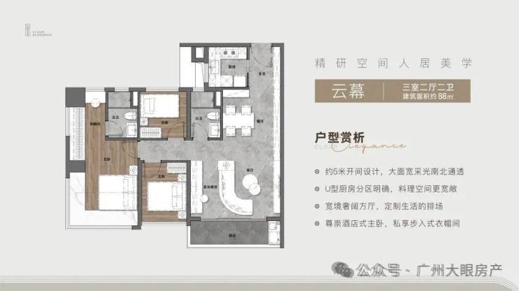 云筑上品规划了5栋住宅,为了采光最大化,所有楼栋都是采用蝶式塔楼的设计,新规后的项目,所以户型使用率方面都超过100%