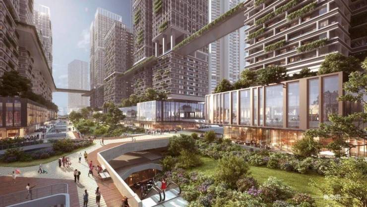 👉 在建筑手法上,它以多元业态满足更国际化的生活需求,规划以400米的双子塔重新树立白石洲的识别性;