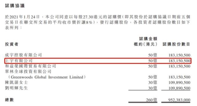 其中,上宇有限公司出资50亿港元,认购股份数1.83亿股,持股比例1.875%。这家公司是由黄光苗全资持有并于英属维尔京群岛成立的投资控股有限公司。