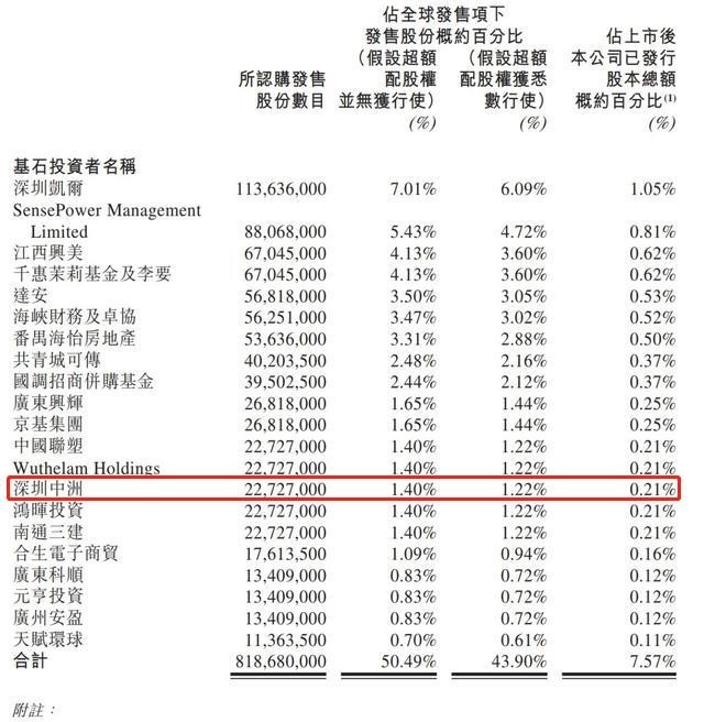去年,21名基石投资者共同认购恒大物业股份8.1868亿股,占其发售股份总数的50.49%。其中,黄光苗透过深圳中洲出资约近千万港元,参与认购2272.7万股,对应持股比例为0.21%。