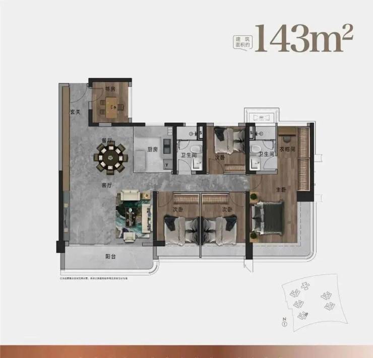 143㎡户型:南向宽景4开间设计 | 约36.5M环幕采光面 | 270°环幕瞰景主卧|多元化功能阳台