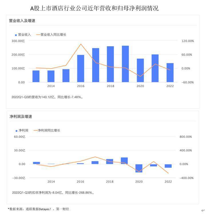根据通联数据Datayes,A股6家酒店上市公司2019年实现营业总收入266.21亿元,净利润14.67亿元。2020年疫情爆发,酒店行业首当其冲,行业营收较2019年下滑36%,净利润巨亏18.36亿元,同比下滑225%;2021年疫情得到有效控制,行业营收出现短暂回升,但仍不到2019年规模的八成;2022年,传播性更强的奥密克戎毒株流行,疫情防控政策收紧,行业前三季度净利润亏损8.04亿,同比下滑269%。3年来6家公司合计亏损31.59亿元。
