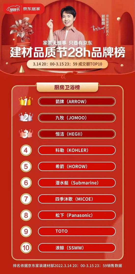 3月14日20:00至3月15日23:59,箭牌卫浴凭借过硬的产品质量和优秀的消费者口碑,产品成交额稳居TOP10内,连获京东平台建材品质节家装建材榜、厨房卫浴榜、定制卫浴榜三大榜首!此次荣登三榜首不仅是消费者对箭牌卫浴产品的肯定,也是箭牌始终坚持品质生产与诚信经营,以及持续深化电商营销的努力成果!