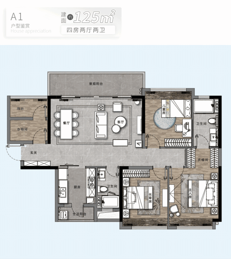 至于户型,只做了两个,建面约105㎡三房、建面约125㎡四房,为改善而来。