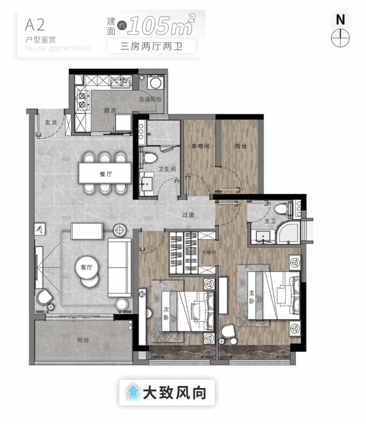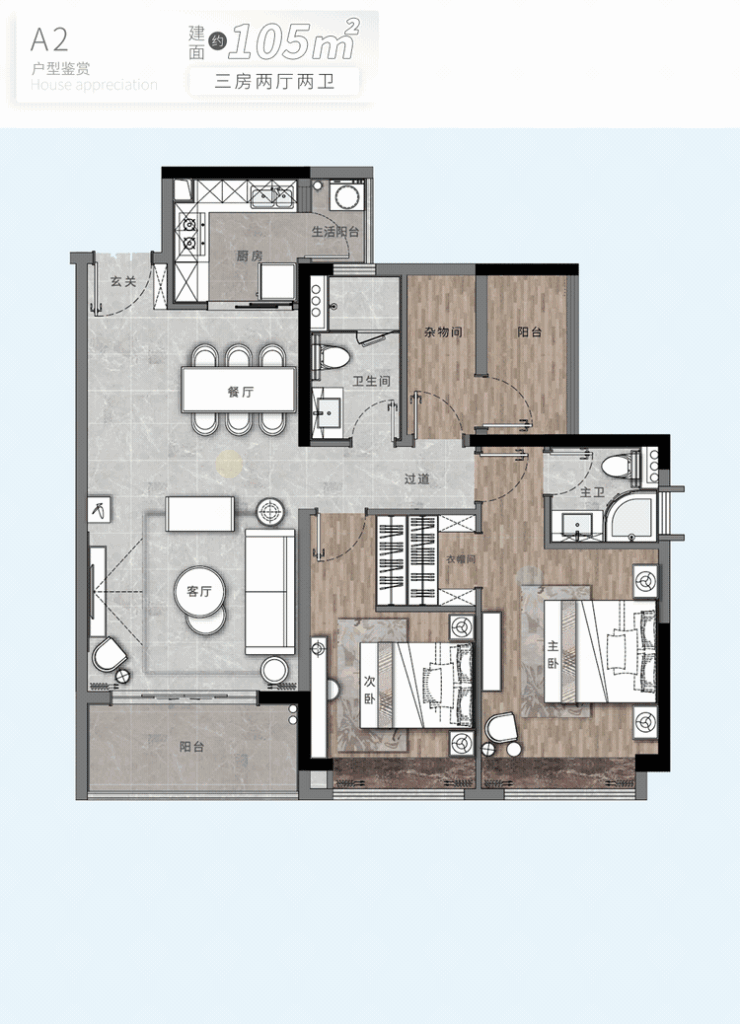 建面约105㎡三房,三开间朝南,客厅、主卧、次卧统统南向,每天被自然光无限宠溺。