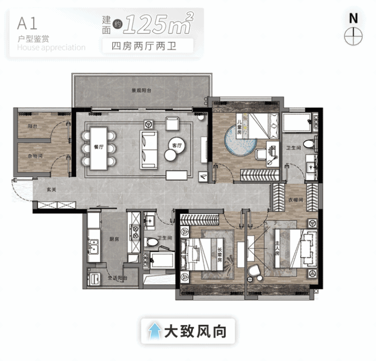 滑动查看125㎡户型通风采光图