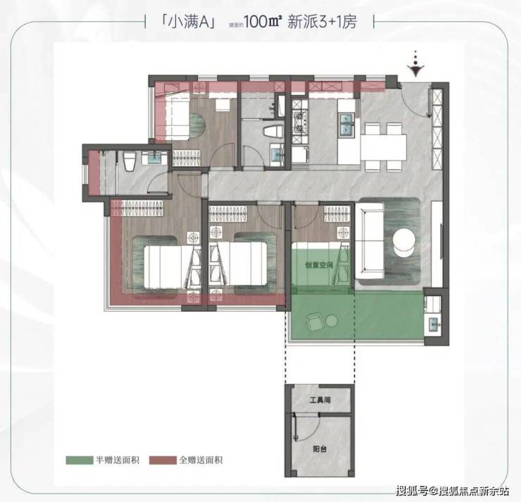 产品:超100%得房率,小户型享大平层尺度,南北双阳台。