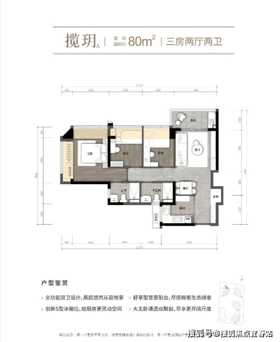 80㎡做到真三房+双卫,主卧带飘窗,适合首置