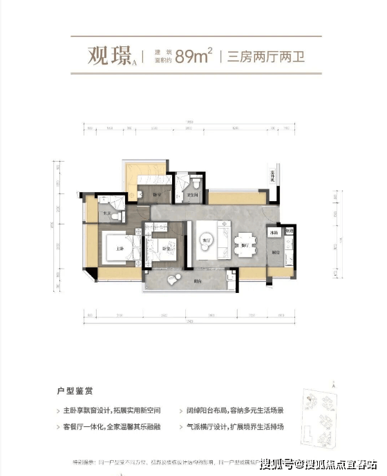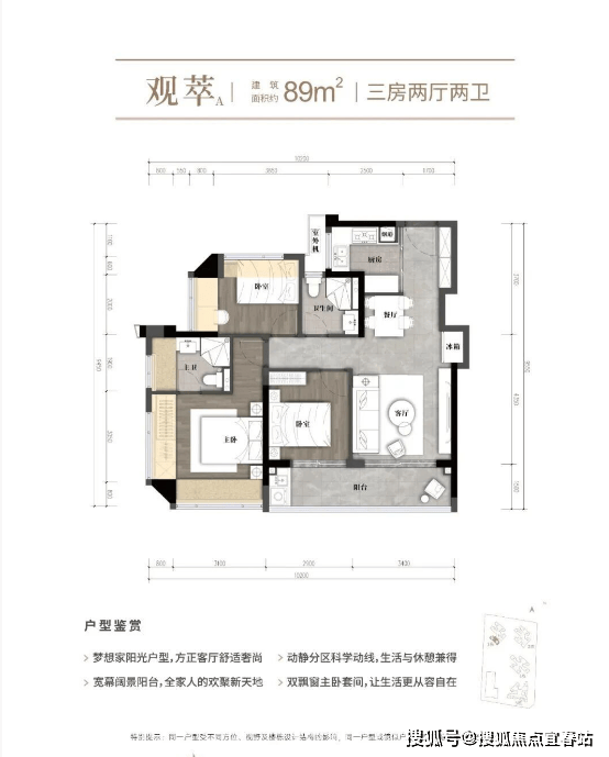 👉 89㎡三房两卫:总价 335–375万,单价 3.8–4.28万/㎡