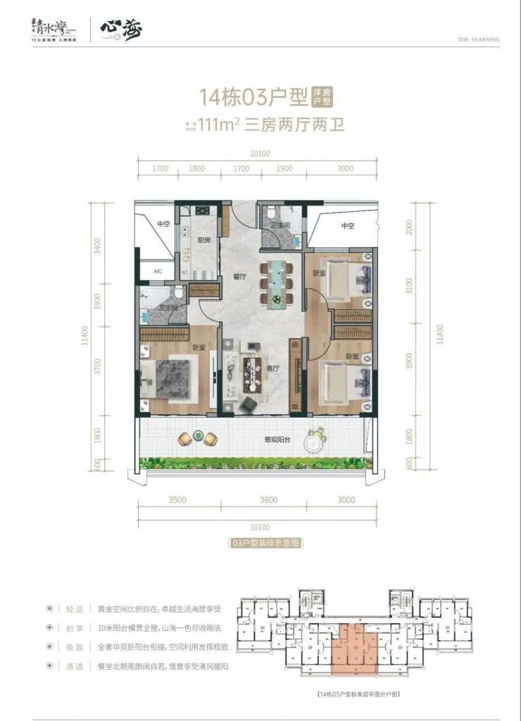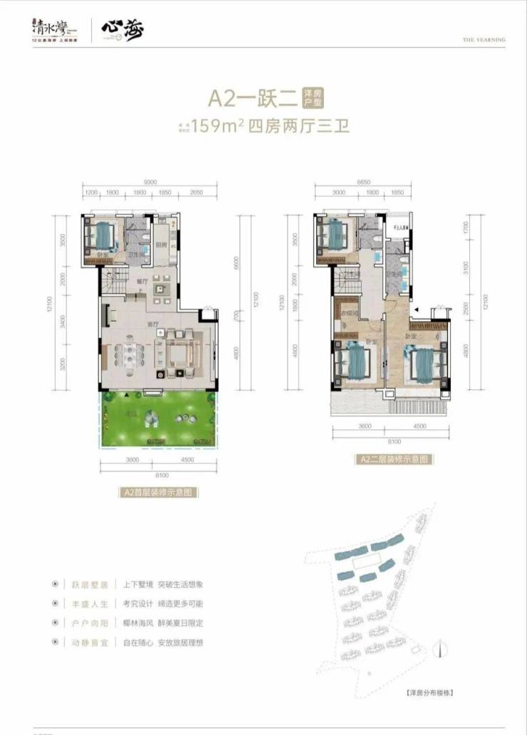 『清水湾心海A04-3地块,心海墅』叠拼和大平层【地块编号】:A04-3地块【用地面积】:约4.13万㎡【建筑面积】:约2.47万㎡【组团总容积率】:0.6【组团总绿化率】:>35%【物业费】叠拼5.8元/㎡/月,洋房3.8元/㎡/月【产权年限】:70年【楼栋数】:14栋(叠拼)5栋7层高大平层洋房【总户数】:146户,70套(叠拼)76套洋房【交付标准】:精装交付【面积段】:目前在推叠拼产品面积约:127、156、171㎡。洋房: 159平,175平,177平,225平。
