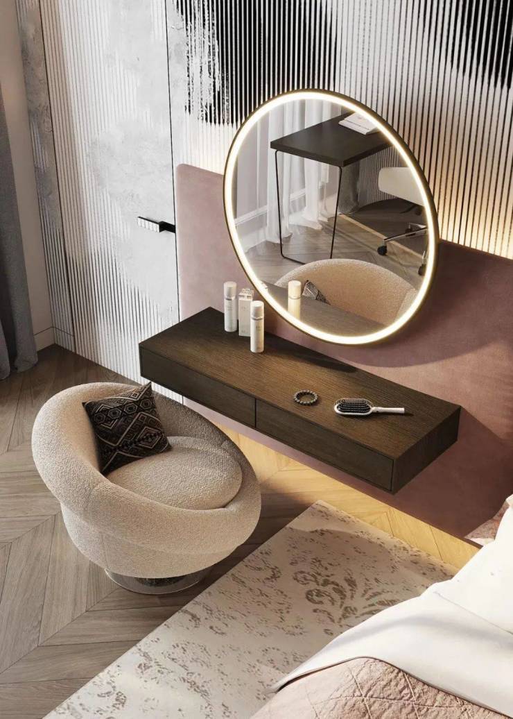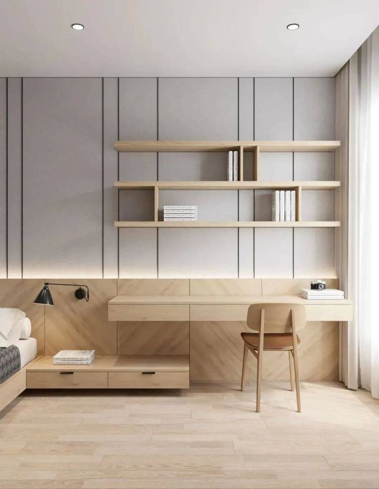 传统床头柜占用的空间比较大,缺少个性化与时尚感,如今,年轻人在传统床头柜的基础上做减法,将床头柜悬挂在墙面上,与背景墙一体化定制,整齐划一,高级感满满。