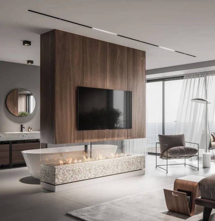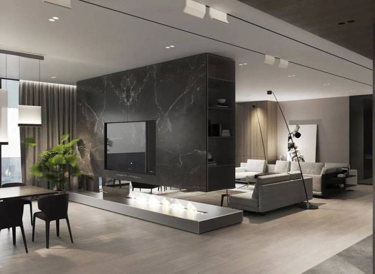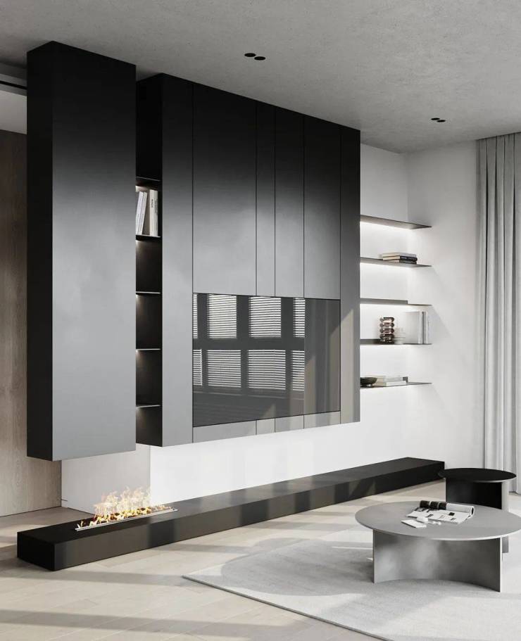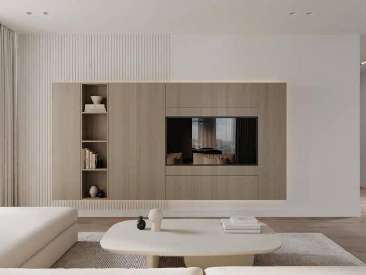 悬浮式设计,不只有柜体可以规划,电视墙作为空间隔断,选择悬浮式设计是当下比较流行的方式。