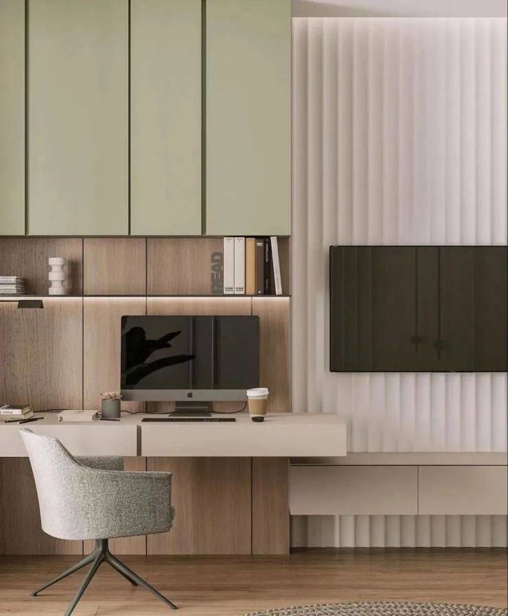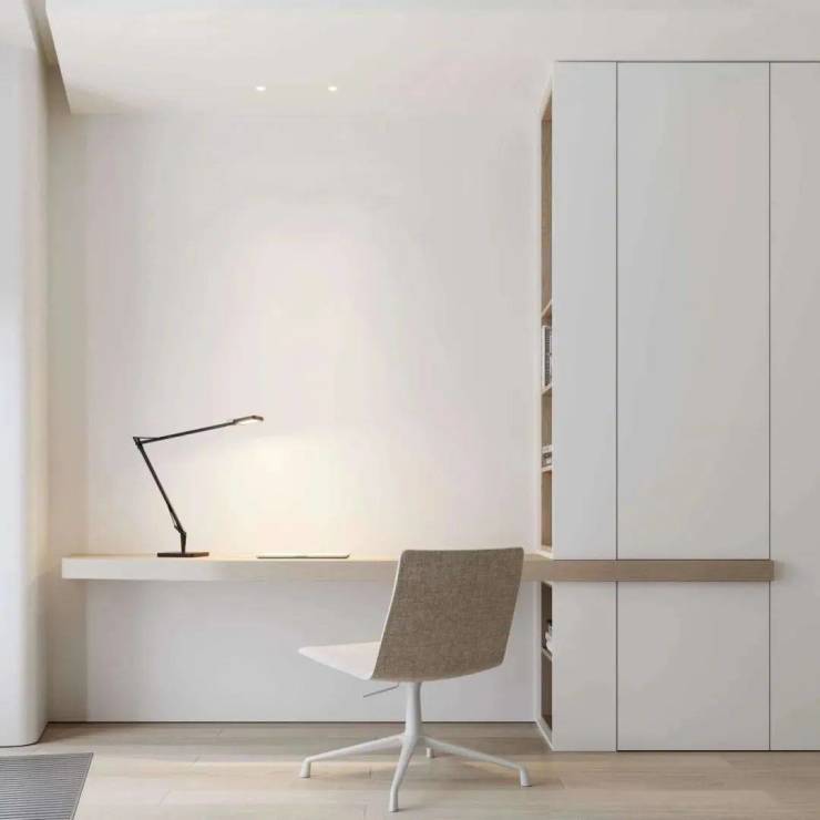 一个温馨舒适的办公区能够为枯燥无味的工作增添些许幸福感。对于追求个性,需要节省空间的家庭而言,书桌可以与书柜、展示柜等一体化定制,造型简洁,不占据空间,让家更显宽敞。如果窗边风景不错,可以借助窗户布置悬浮式办公桌,这种方法不仅能解锁窗台的多种用途,还能收获窗外好风光。