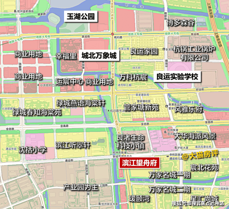 再看项目周边,整体以住宅和产业园为主,东侧为滨江万家名城等小区,北侧为良渚生命科技小镇。