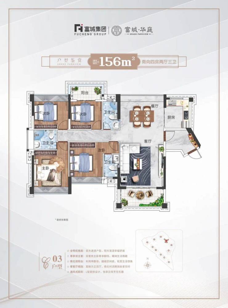 主力户型面积段为100-156平方米,尺度空间奢阔舒适,是三房配置起的纯粹高端居住社区。