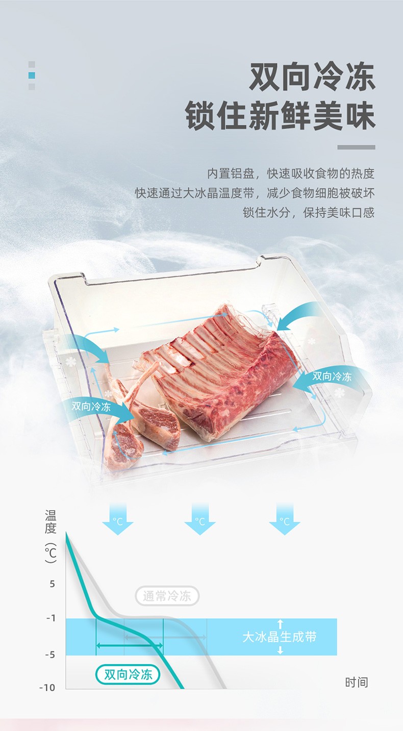 日立R-BF330JC冰箱的保鲜功能也非常不错,它有一个叫“双向冷冻”的功能,它通过内置铝盘,快速吸收食物的热量,快速通过大冰晶温度带,减少食物细胞被破坏,锁住水分,保持美味口感。