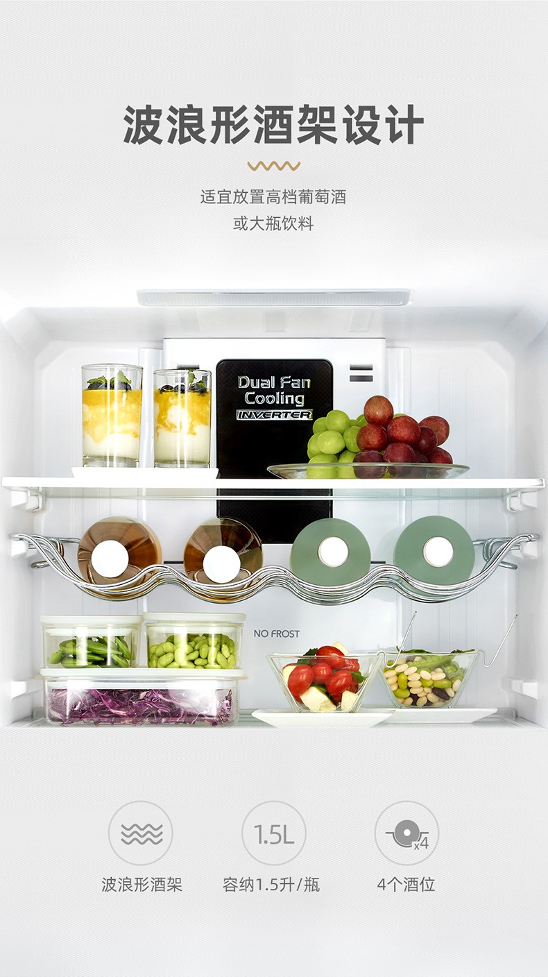这款冰箱在冷藏室中还有一个很有趣的设计,那就是下图中这个波浪形的酒架。这个酒架被放置在一个专门的盖板槽中,可以用来存放各种酒水和饮料,长度和高度刚好可以容纳市面上常见的1L或1.5L酒瓶,无论你是个红酒爱好者还是碳酸宅男,都可以将自己的最爱摆放在上面。对于我这种喜欢喝酒的人来说,打开冰箱就能看到自己最爱的酒水,真的是一件挺幸福的事情。