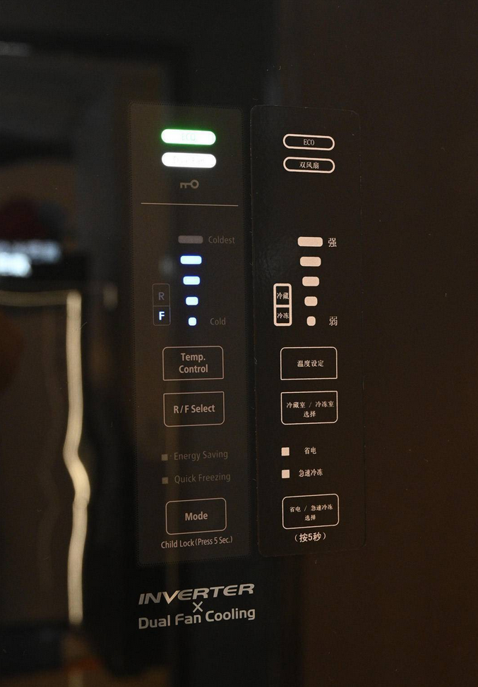 日立R-BF330JC冰箱就如同一个黑色的镜子,它使用了全玻璃面板,星空黑的配色真的非常大气,往家里一放立马将家装品位提升一个档次。它的正面是一整块面板,采用了触摸式设计,所有图标亮起的时候都非常清晰显眼。我觉得如果是在黑夜中亮起,一定会有一种别样的美感。