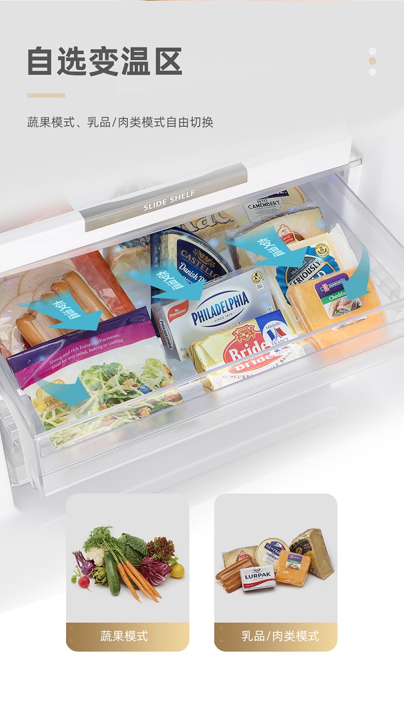 日立R-BF330JC冰箱冷藏区的下方有一个独立空间,这里就是它的自选变温区域,拥有蔬果和肉类乳品两种存储模式,可以实现不同种类食物的保存,更好的保持食材的口味,并且延长他们的保质期。自选变温区的调整开关在内壁的上方,是一个拨动式的开关,通过左右波动来调整不同的模式,非常简单方便。