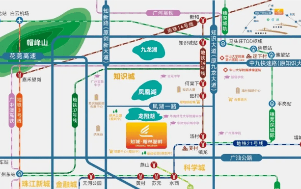项目距离地铁14号线知识城支线旺村站约1.3公里,步行有点距离,也可以通过公交或者电动车等接驳;2站能换乘21号线能直达天河员村。自驾方面,周边有广河高速、增天高速,还有知识大道、广汕快速路等快速路,能速达黄埔科学城、天河,对在知识城、科学城上班的人群来说会更方便。