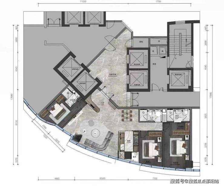这个户型同样设计了专属的电梯,进门为玄关,餐客厨做到了一体化,厨房带岛台,客厅一侧还划分了独立的办公空间。主套和次卧分布在不同的两侧,形成独立的动线。