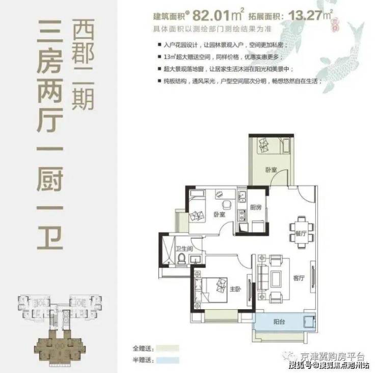 82㎡(3房2厅1厨1卫),赠送13㎡;