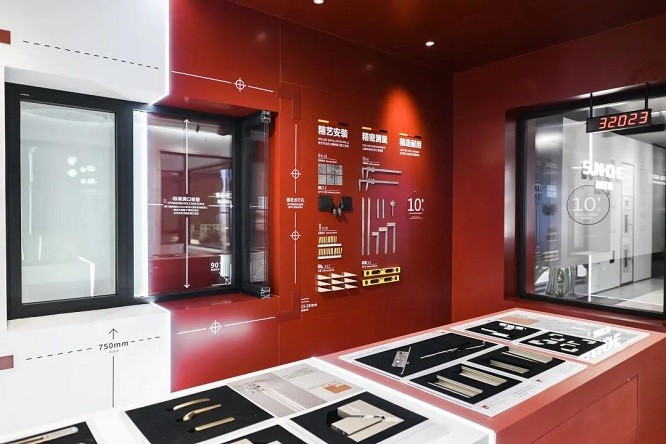 独特的「新豪轩红」从展厅整体外观到形象墙、洽谈区,再到门窗展示区、产品体验区,采用了不同的组合式设计和软装搭配,以新颖设计充分展现出现代家居极简轻奢风格的时尚感与高级感,并将新豪轩门窗的行业属性、主打产品和企业文化融入空间,于细节中展现轻奢魅力,演绎精致舒适生活。