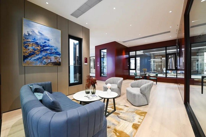 新豪轩全新终端SI形象展厅,将展厅分隔成不同的部分,打造多个生活场景,用艺术化情景化展示销售逻辑,更能使消费者深度了解新豪轩产品与加盟代理政策,最终实现终端销售。