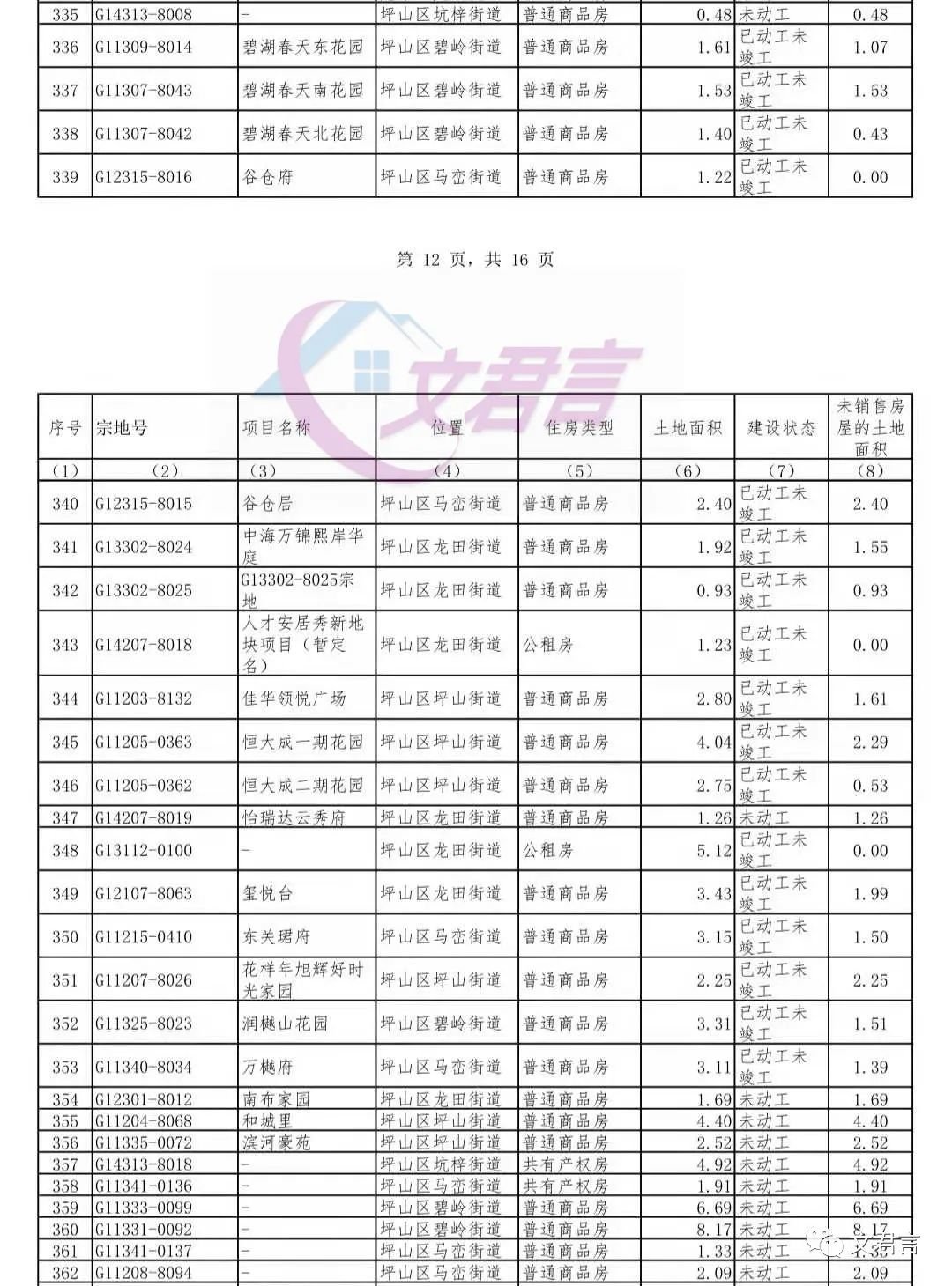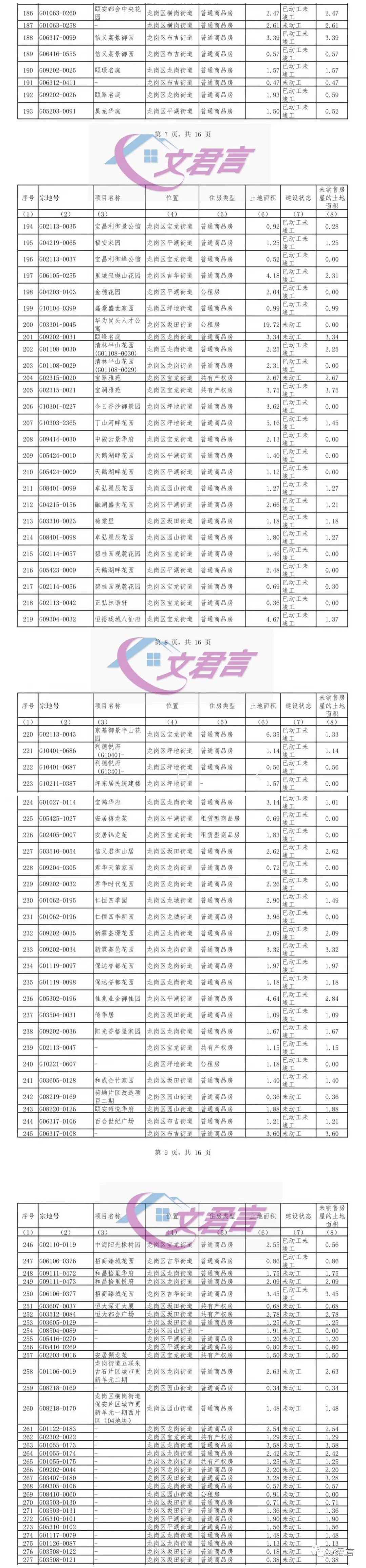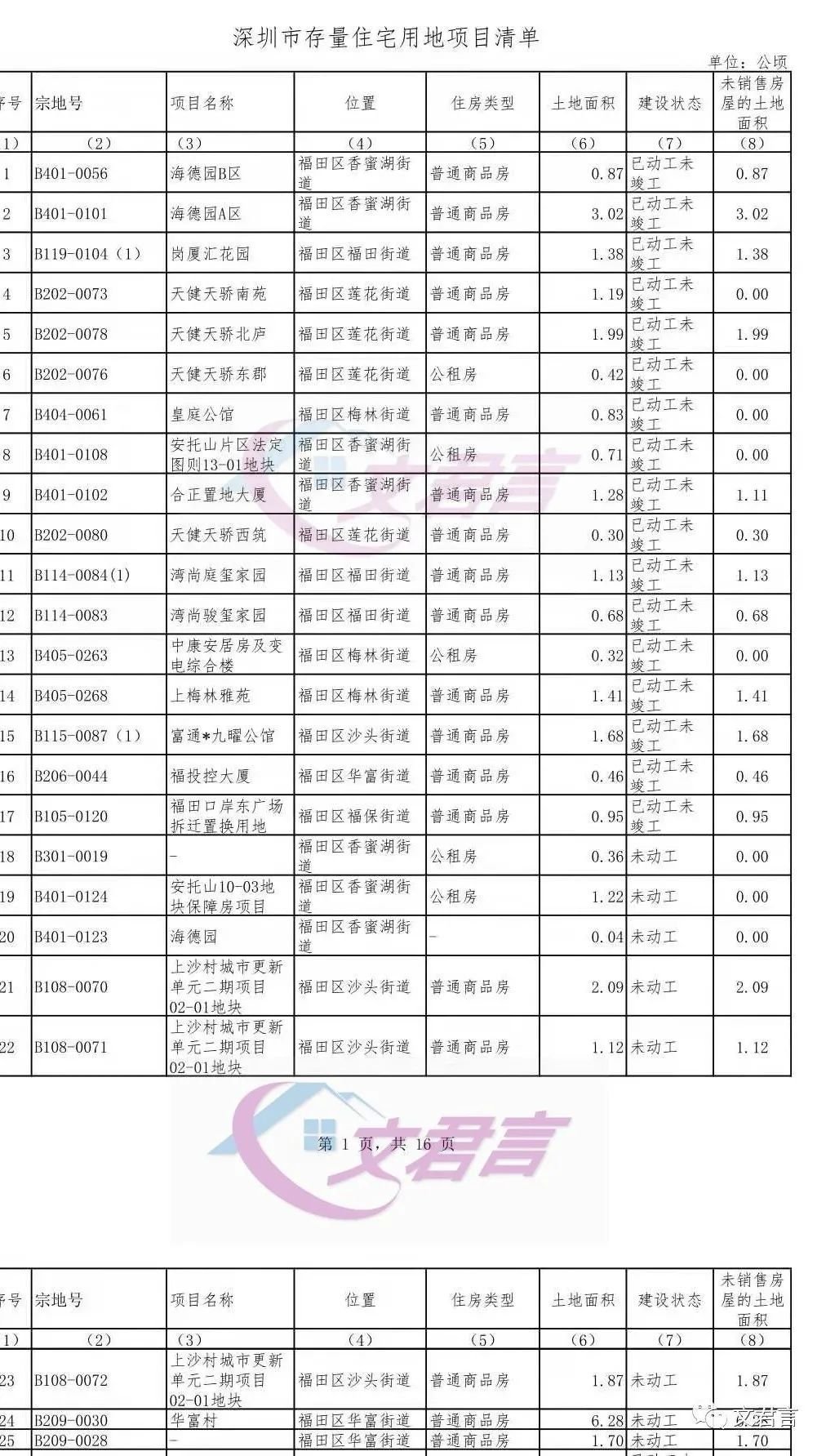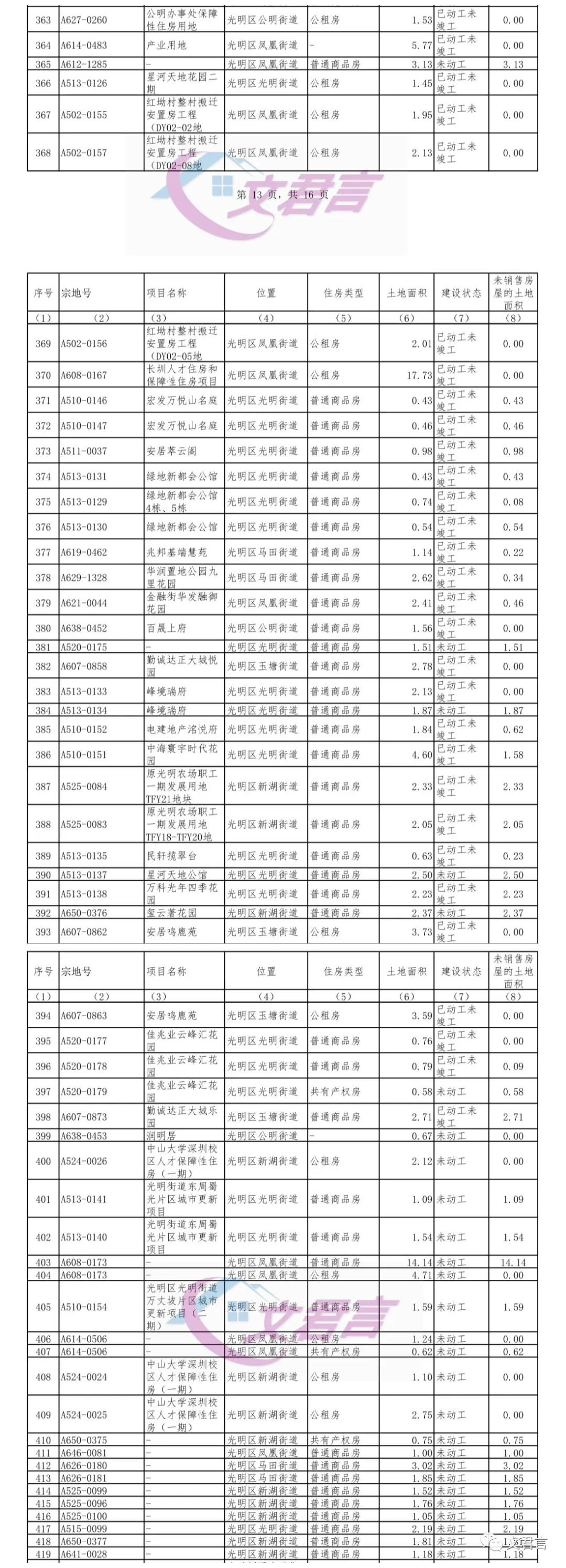 2020年12月31日,深圳规划和自然资源局发布深圳市存量住宅用地信息(截至2020年12月31日)。 信息显示,深圳存量宅地共有442个,总面积970.78公顷,未动工土地面积348.11公顷,已动工土地面积622.87公顷,其中已动工未销售土地面积为307.74公顷。 其中,龙岗区存量住宅项目最