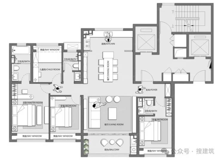 这个户型重点是星级主卧套房,270°环景飘窗、独立卫浴(五件套)、衣帽间,同时还可以利用飘窗位做书桌。无论是视觉空间还是采光通透,均得到升级,为居者带来不一样的居住感受。