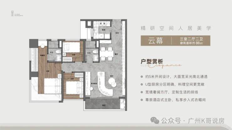 建面约88㎡三房两厅两卫;