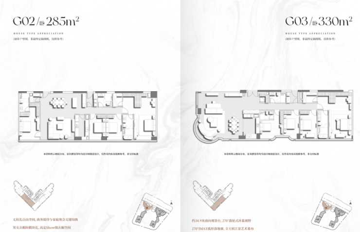 高区为6梯4户布局,户型包括285㎡、330㎡、400㎡,顶层复式层高可达3.9米,标准层也有3.55米,空间通透感十足。
