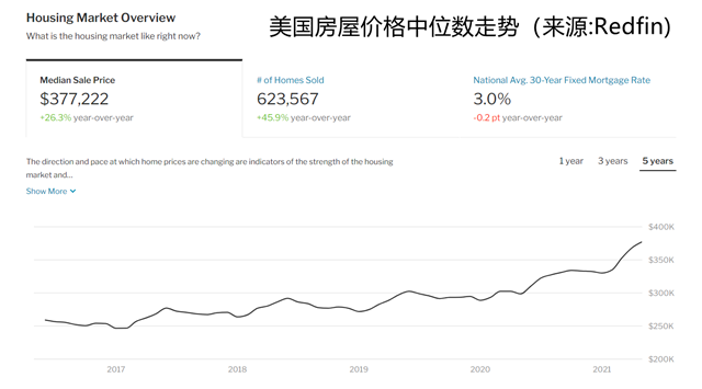 全国房地产经纪人协会(NAR)6月底的较新数据显示,美国现存房屋价格中位数为35.03万美元(约合227万元人民币),同比大涨23.6%,为有数据统计以来的较高年涨幅。
