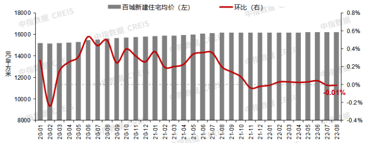 8月,百城新建住宅平均价格为16203元/平方米,环比下跌0.01%。