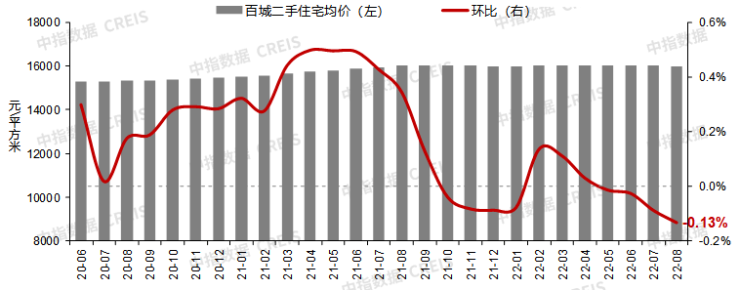 百城二手住宅平均价格为15991元/平方米,环比下跌0.13%,跌幅较7月扩大0.04个百分点;同比止涨转跌,跌幅为0.12%。