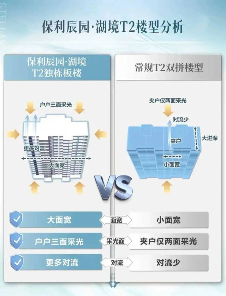 T2板式可极致延长南向面宽,规划更多南向开间;且户户单边位,直接造出L型转角空间。