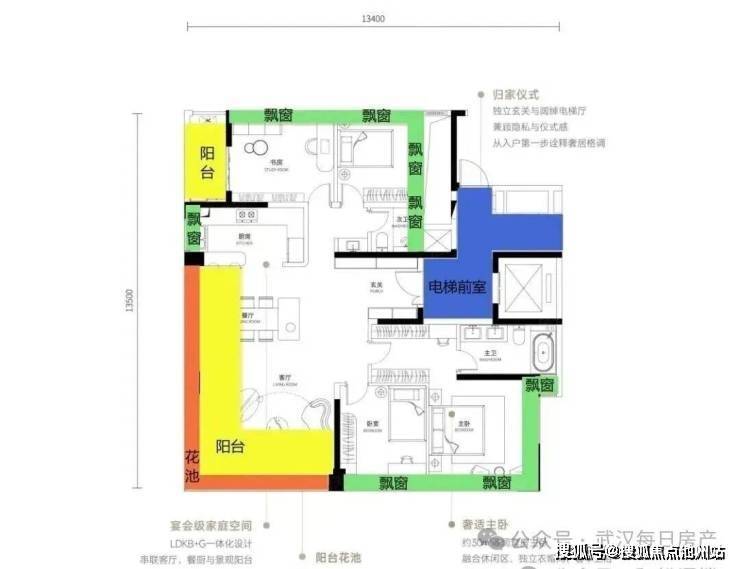 超大电梯前室,出电梯就仪式感满满;客餐厅270°拐角大阳台+270°拐角大花池,拓展出约59平的宴会级社交场域;除客餐厅外,其它房间均有飘窗优化空间,切实做到了360°空间赠送;主卧和北向次卧,实现了少有的双面飘窗或飘窗+生活阳台的双面空间优化……