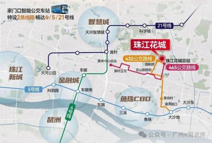 【465】路公交无缝接驳地铁4/21号线黄村站,【432】路则直达地铁5号线大沙地站,可畅达鱼珠CBD、珠金琶CBD