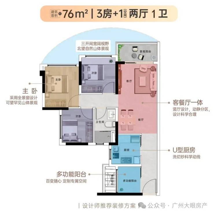 【76㎡3+1房2厅1卫】餐厅、客厅连通布局,低总价晋阶天河