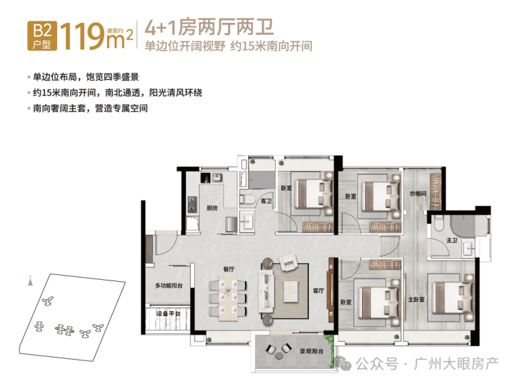 【119㎡4+1房2厅2卫】单边位布局,15米南向开间,南北通透