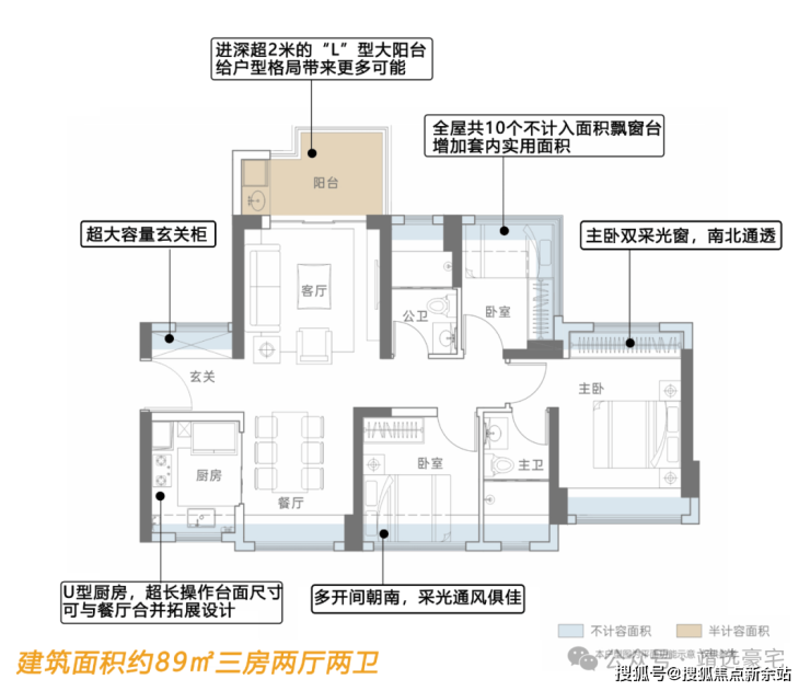 ●配备局部进深达2.1米、约6.2㎡的L型大阳台;