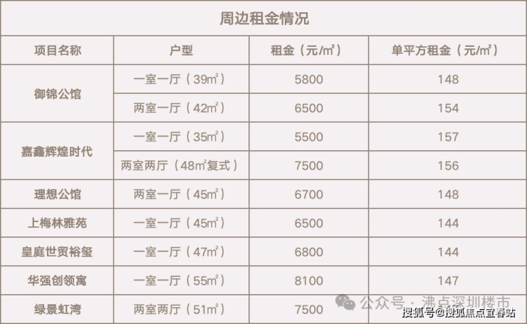 项目坐享福田中心占位+双地铁口+2.5公里高阶醇熟配套+名企京基开发,周边汇聚高密度优质租客群体,承租率高位保障。参考片区周边公寓租金水平,预估项目租金可达140-160元/㎡,投资首选金牌资产。(信息来源:乐有家;数据仅供参考)