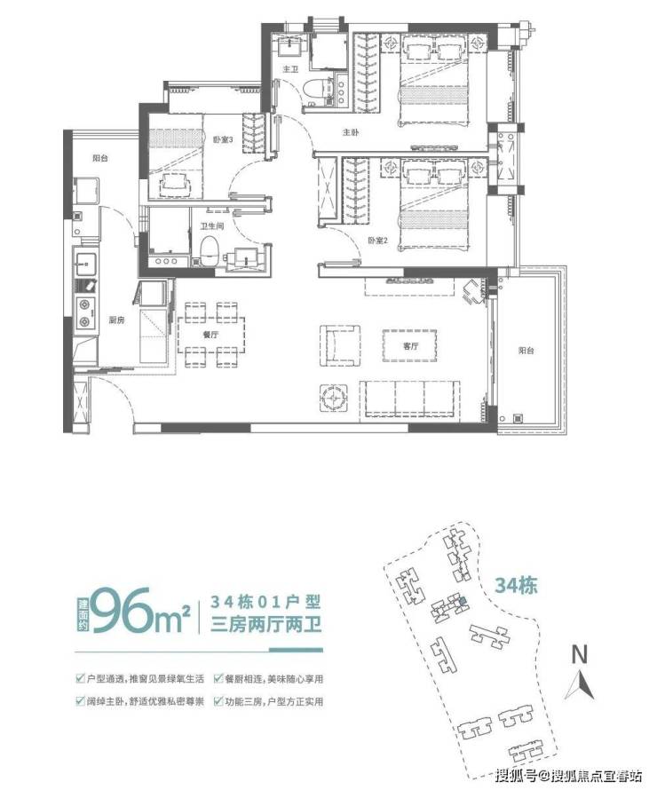 建面约96㎡滨水舒适三房,餐客厅一体化,连通观景阳台,臻藏生活美景,客厅与休息区以科学合理的布局分隔,动静皆从容,卧室均规划大面宽飘窗,放大房间尺度感,营造舒适生活体验。