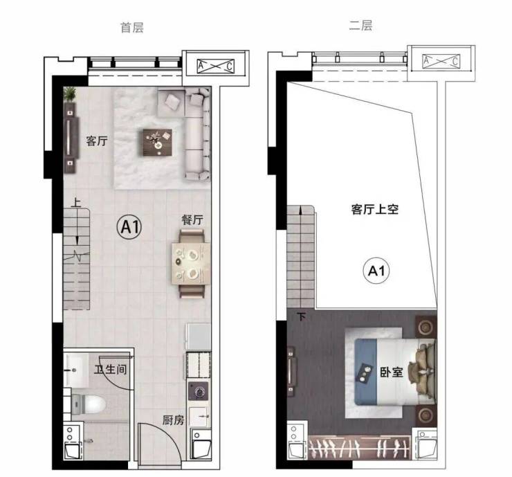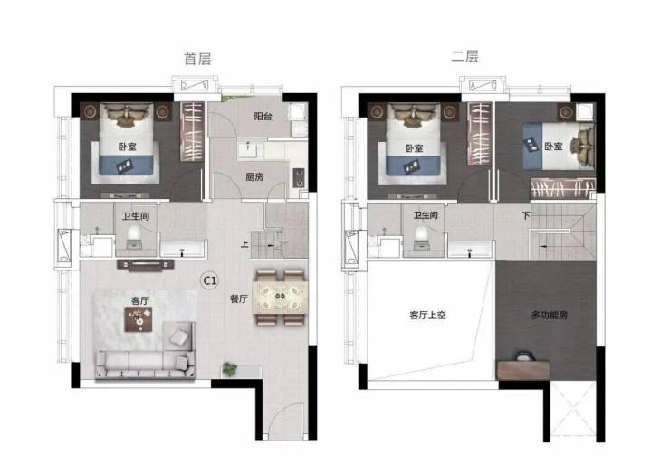 4.5米极致层高,秒杀市场常见LOFT产品。一层可作为开放式客厅与餐厨区,二层规划两间卧室+多功能空间,书房、儿童乐园、直播间随心变换,52㎡享70㎡生活体验。