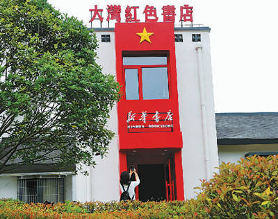 游客在安徽省六安市金寨县大湾村红色书店门前拍照。
