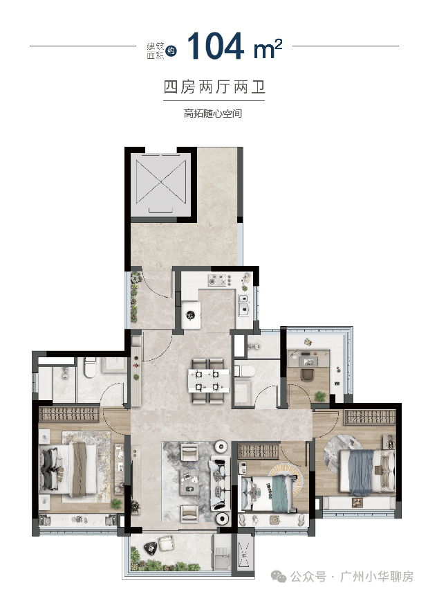建面约104-168㎡纯改善四房,朝南而居,南北通透,阳光清风常伴,满足品质改善需求。