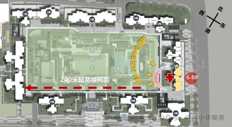 栋间距最大约200米,约等于2.8个国际标准足球场大小;
