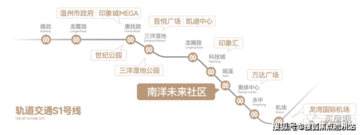 作为温州新一代TOD开发项目,南洋未来社区与轨道交通S1线瑶溪站直接对接,通过S1线1站范围内即达万达广场、印象汇等商业综合体,3-4站范围内可达鹿城核芯的惠民路站,“半壁温州的繁华和诗意”都能于此快速抵达。同时经S1线还可直接到达温州南站、温州东站(规划)、龙湾国际机场并换乘至S2线,出入市区、链接全国。