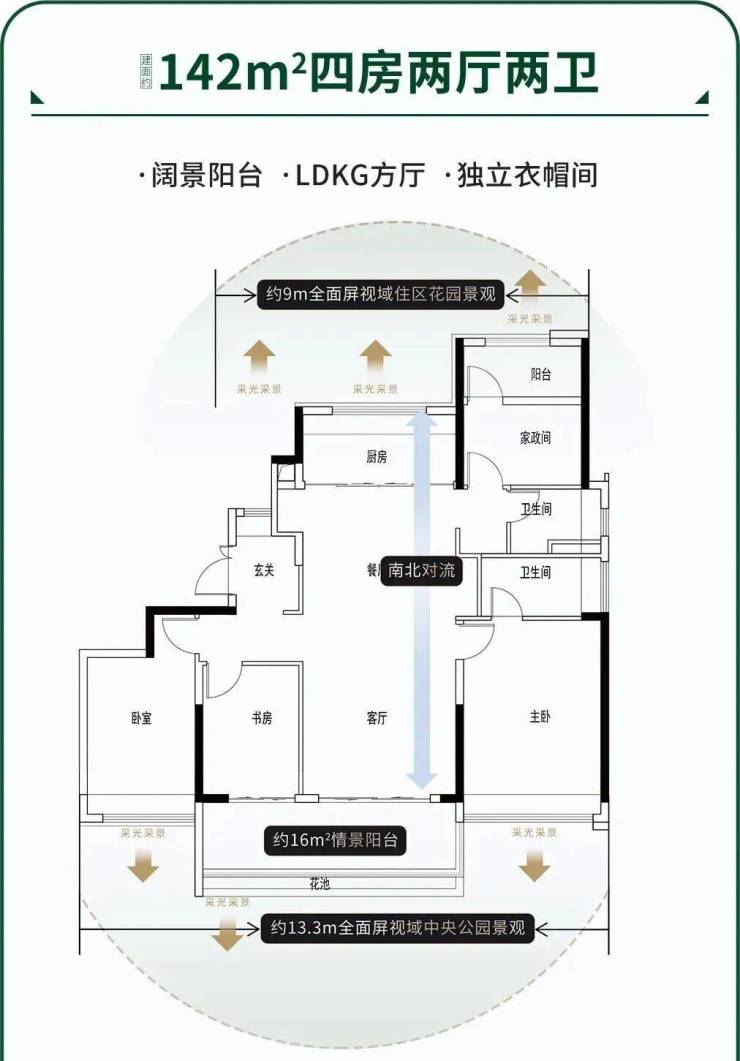 建面142平四房两卫,四开间朝南,面宽14.8米,南北对流,LDK餐客厅一体化,阳台面积约16平,私享电梯厅入户