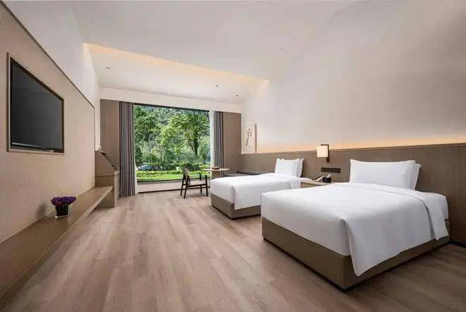 酒店拥有主楼各类客房 136 间,包括山景房、湖景房、泳池房、行政套房、亲子家庭房等各类房型。匠心独具的装修设计风格,质朴新潮,舒适雅致,呈现了乡村田园的活力和魅力。